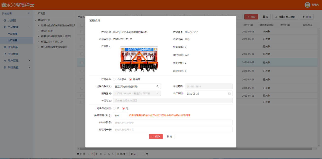 • 產(chǎn)品管理:為播種機(jī)(農(nóng)機(jī))生產(chǎn)廠家和其他農(nóng)資(機(jī))經(jīng)銷商提供產(chǎn)品信息(產(chǎn)品描述、技術(shù)參數(shù)、配置及說(shuō)明)管理;同時(shí)可為播種機(jī)(農(nóng)機(jī))生產(chǎn)廠家、播種機(jī)(農(nóng)機(jī))經(jīng)銷商提供相應(yīng)的銷售區(qū)域管理。