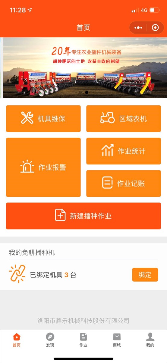 • 首頁(yè):為登錄用戶提供創(chuàng)建作業(yè)、機(jī)具維保、區(qū)域農(nóng)機(jī)、作業(yè)報(bào)警、作業(yè)統(tǒng)計(jì)及作業(yè)記賬等重點(diǎn)功能的快捷入口。