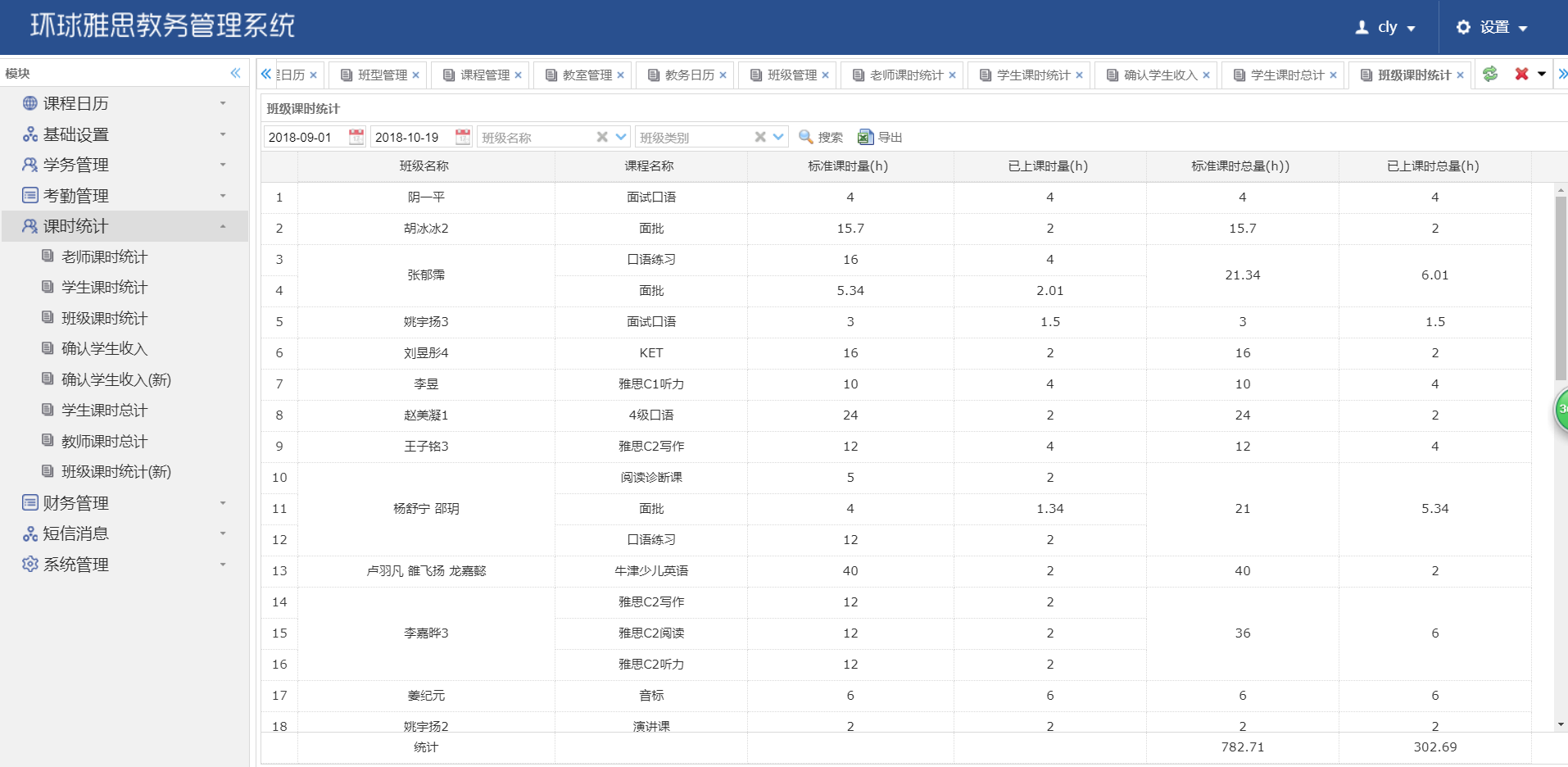 • 課時統(tǒng)計:老師課時統(tǒng)計、學(xué)生課時統(tǒng)計、班級課時統(tǒng)計